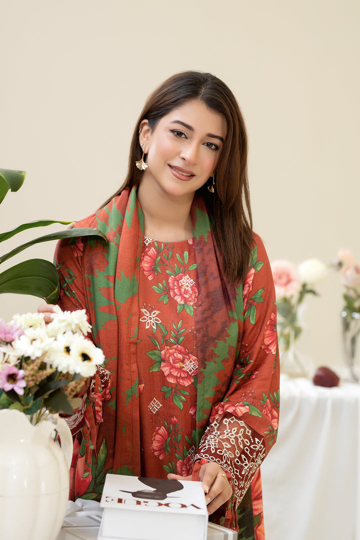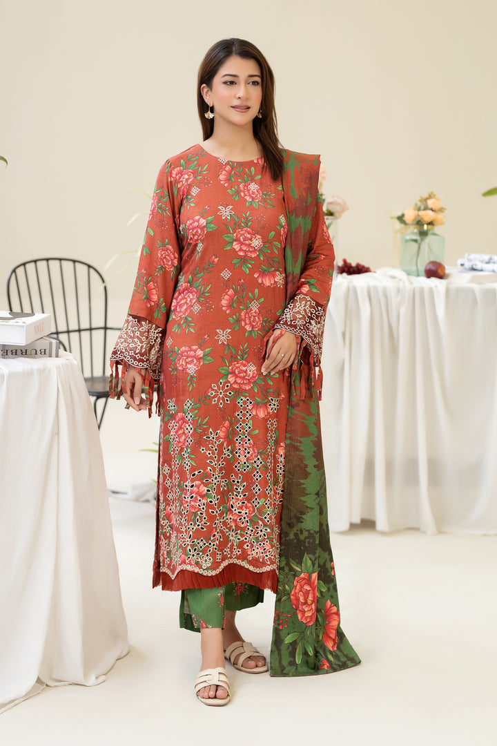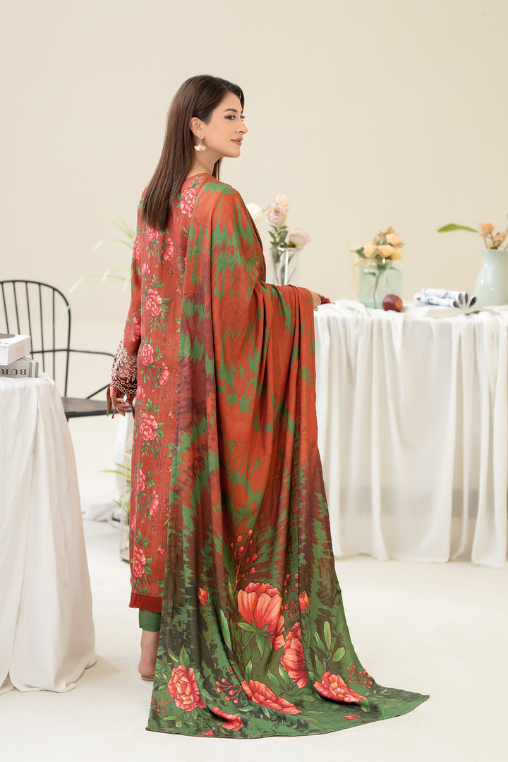 Description: EMBROIDERED+PRINTED STAPPLE JACQUARD WITH PRINTED SHAWL + PRINTED TROUSER