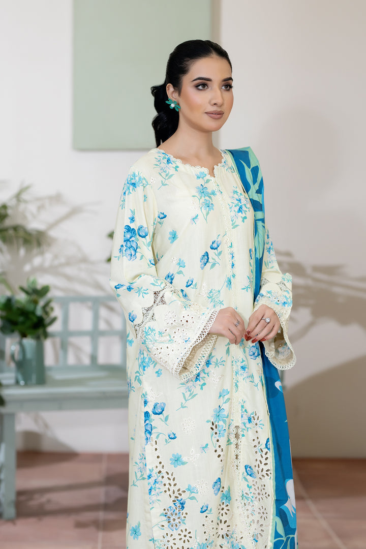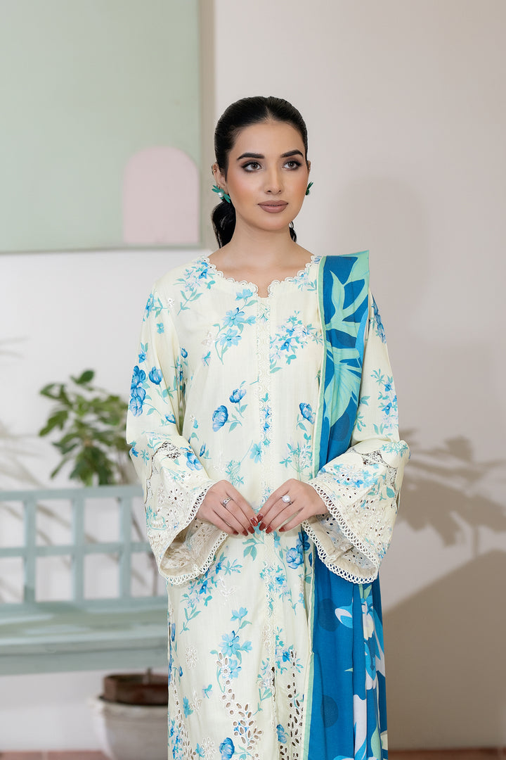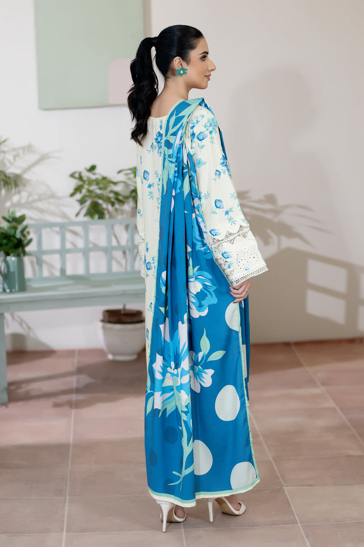 Description: Embroidered + Printed Staple Slub with Printed Shawl