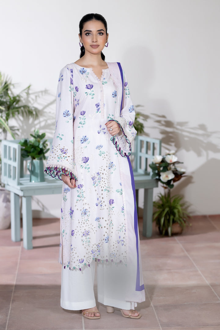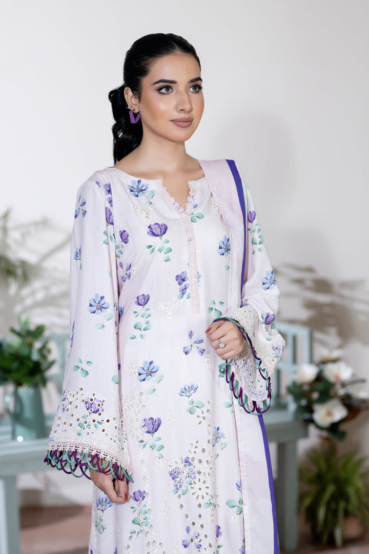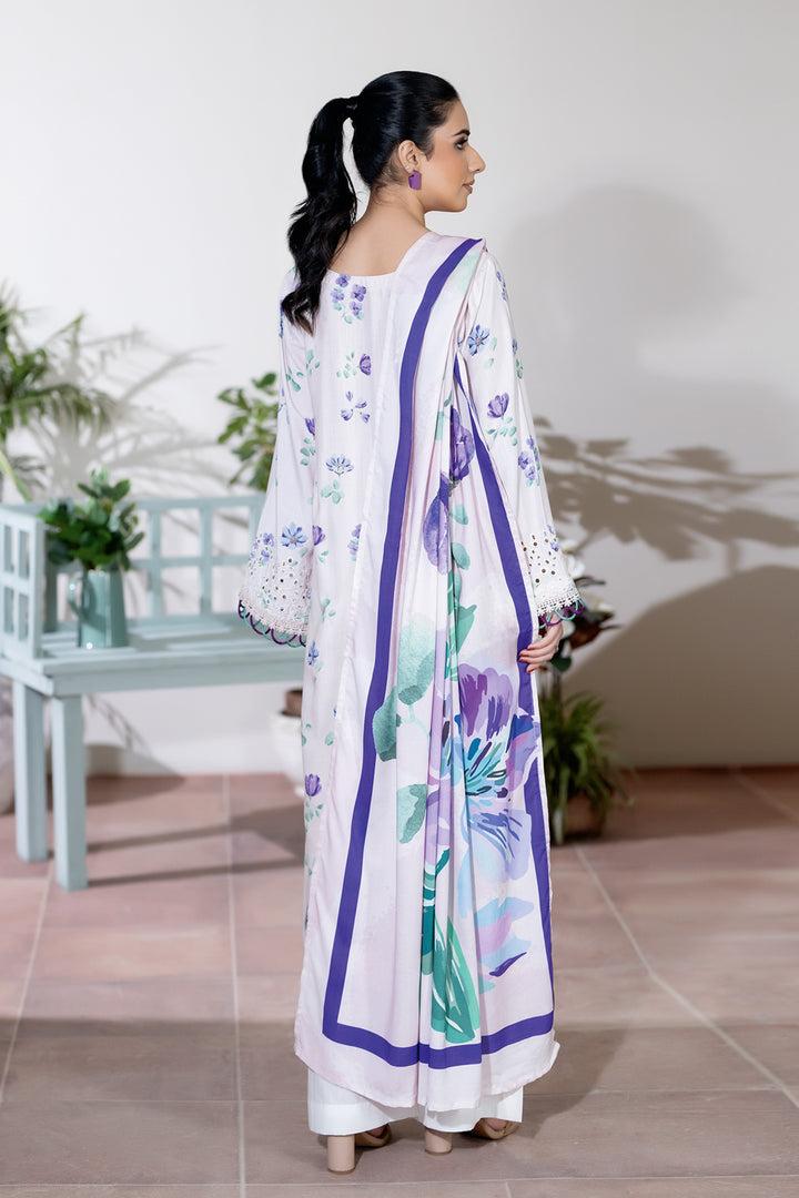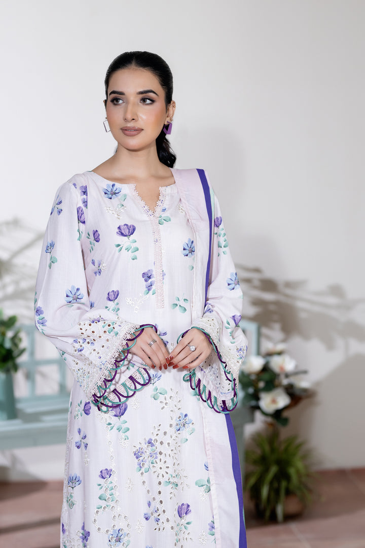 Description: Embroidered + Printed Staple Slub with Printed Shawl